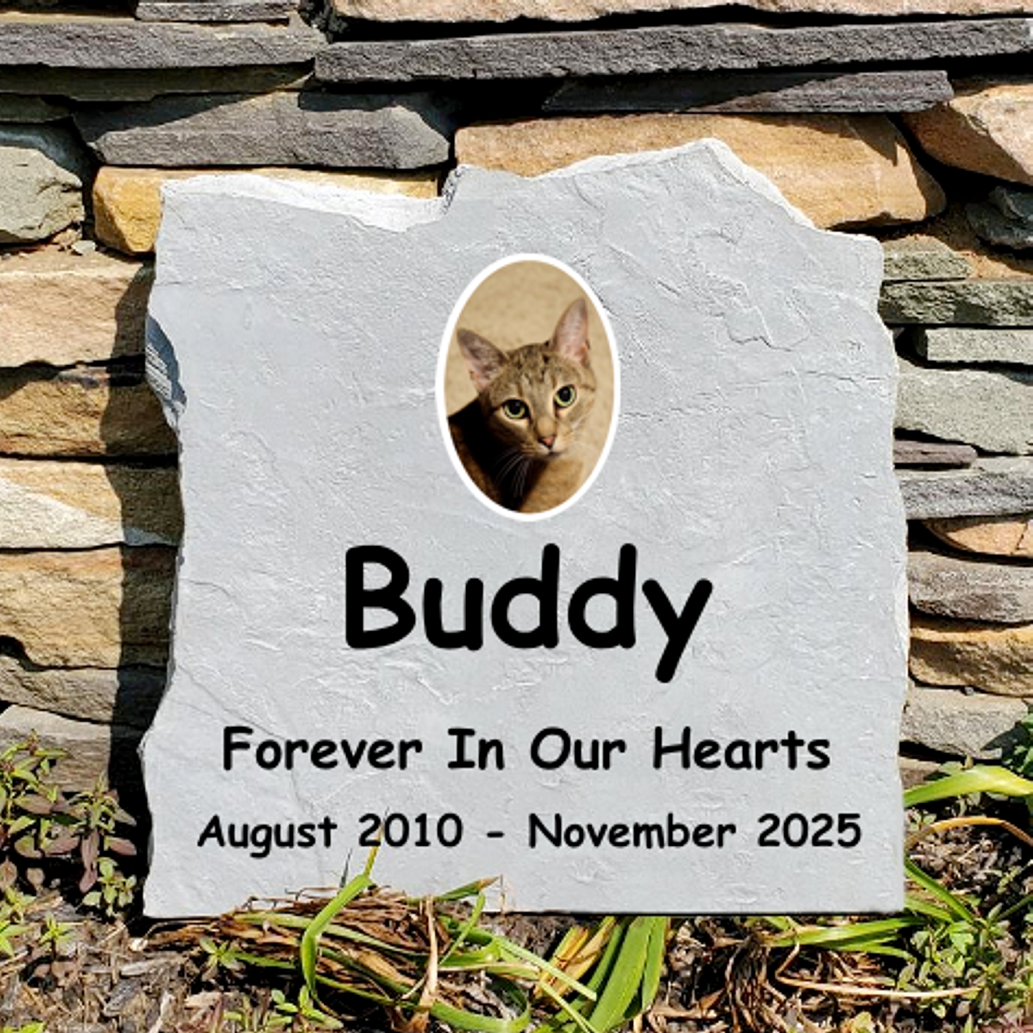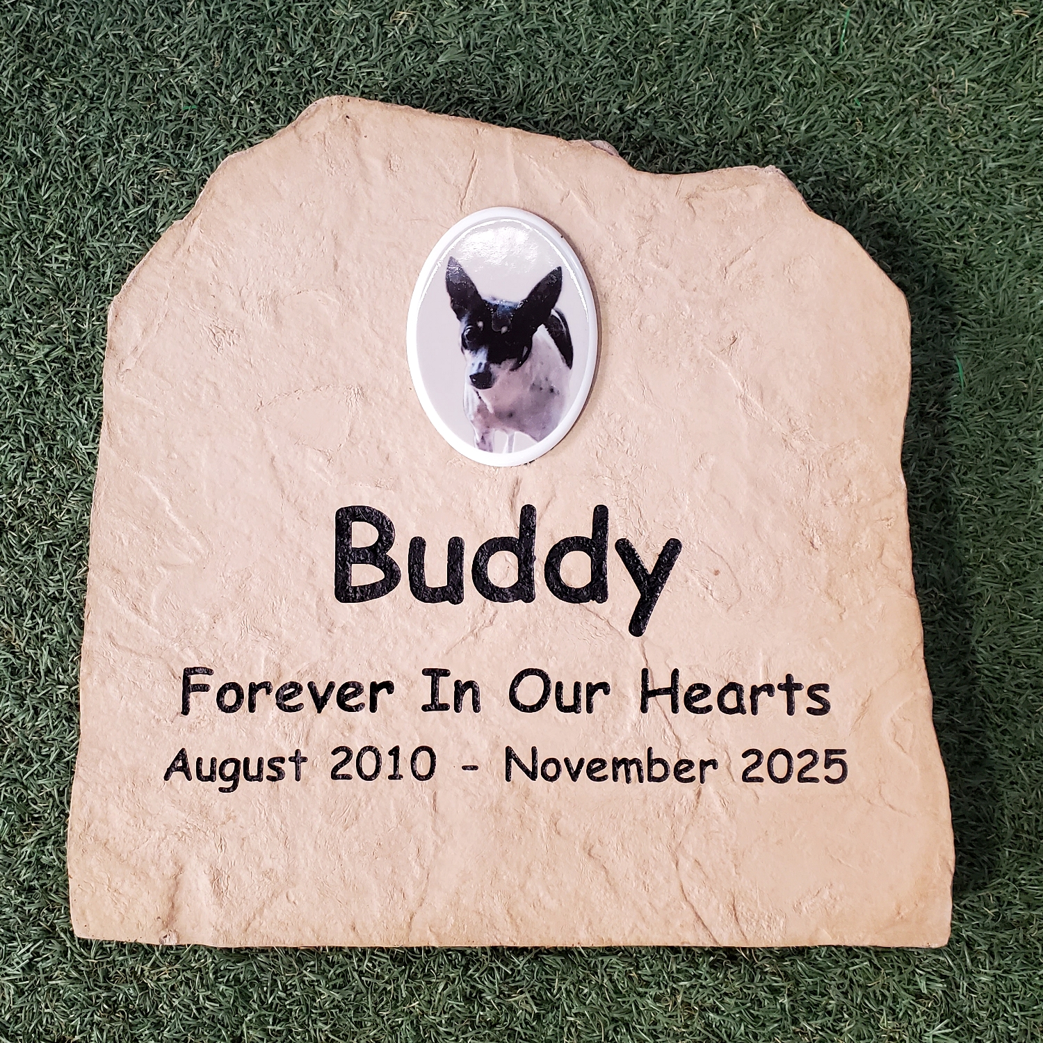 Honor the memory of a beloved pet with a beautifully crafted engraved Color Porcelain Tile Memorial Marker. Each marker is made from solid, enhanced concrete with a natural shape that blends seamlessly into any garden or outdoor space. It showcases your pet’s actual photo along with a custom message engraved directly into the surface. Our artisans sandblast the design directly into the surface and fill it with durable paint, ensuring it stands strong against time and weather.