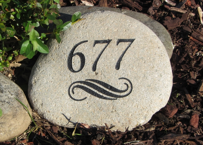 Large River Rock is 8″ – 10″ Wide. Engraving is offered for your house number in a wide choice of fonts. You may select any of our available graphics. The layout will be similar to the picture above.