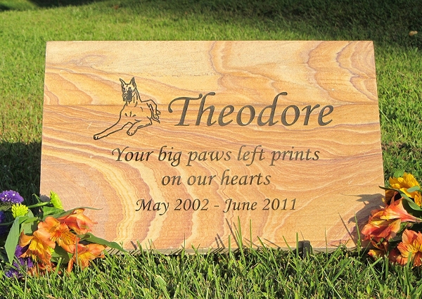 These Tennessee Golden Flagstone pet memorials have a unique pattern flowing through each stone, with shades of soft browns to sunset orange. The lettering is carved deep and highlighted with a black lithochrome to add contrast. The results are truly amazing! Optional outdoor stand is available for purchase.