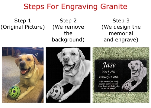 These custom memorials are created from 2″ thick, premium absolute black granite with all edges polished. They are permanently laser engraved with your pet’s picture, text and choice of typestyle. They will withstand the outdoor elements for a lifetime. The upright piece is secured to the base which is also made of premium absolute black granite with all edges polished. Back of upright is not polished. Perfect for use at your house or cemetery. We will email a proof before engraving the upright piece. Assembled monument weighs approximately 70 lbs.